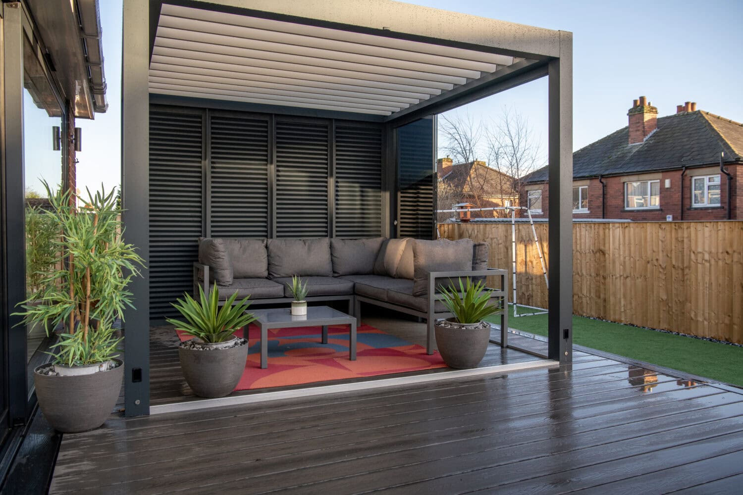 These homeowners purchased a sliding door and an entrance door from Express when they carried out a home renovation several years ago. When they heard about the pergolas now offered through Exterior Spaces, they decided to revisit our showroom in Leeds to look at the new outdoor products to see if they would work as an additional space to sit on top of their raised decking area. They looked in detail at both ranges of our bioclimatic pergolas and opted for our Phanes system as it’s great look and functionality was the perfect solution to enhance their outside space.