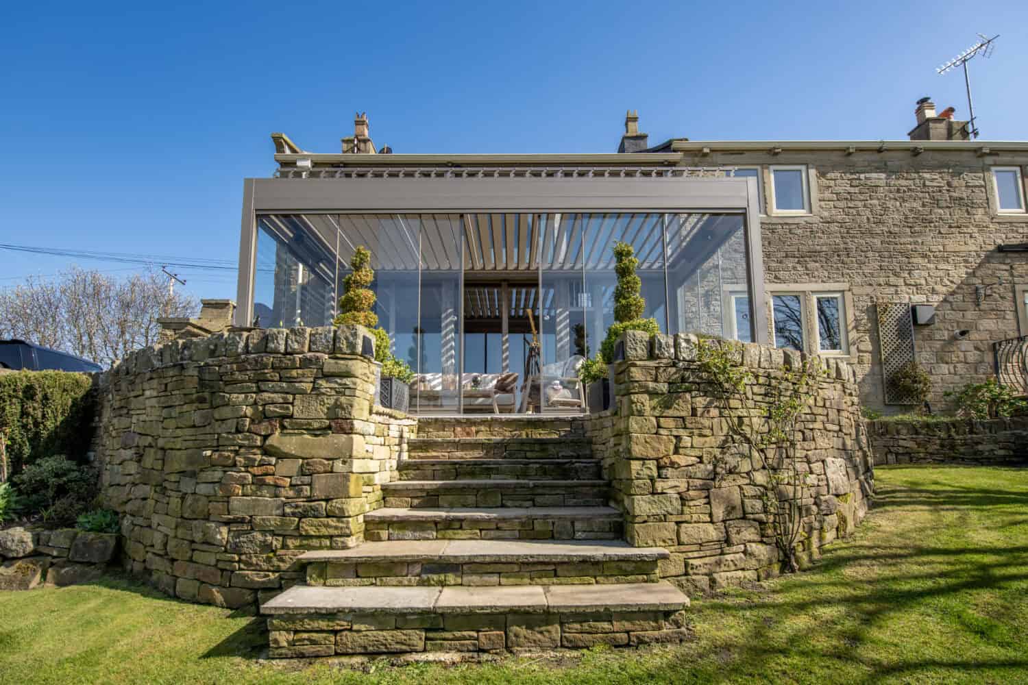 We love creating wall mounted pergolas like this, but we can also create free standing pergolas and adapt our range to create garden rooms, glass rooms and even combine different roof types.