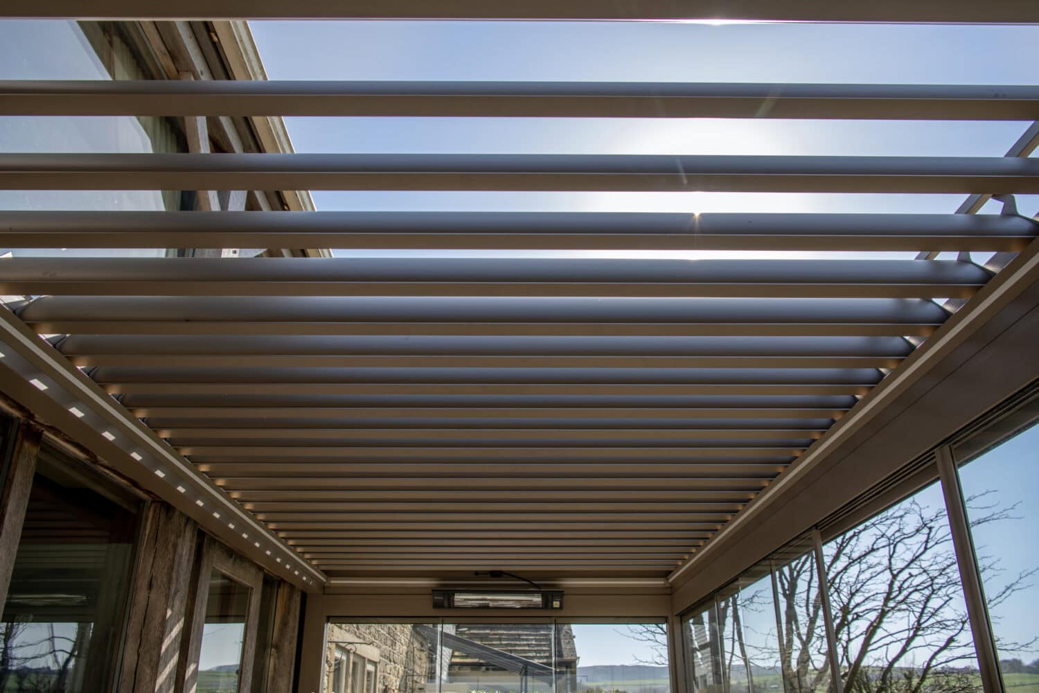 We installed a bespoke bioclimatic pergola into the compact space between the house and walled patio area. The colour chosen was exactly the same as one of our showroom displays, a unique colour sand called Sable Greece 2500, which is a great compliment to the oak beams in front of the rear elevation windows.