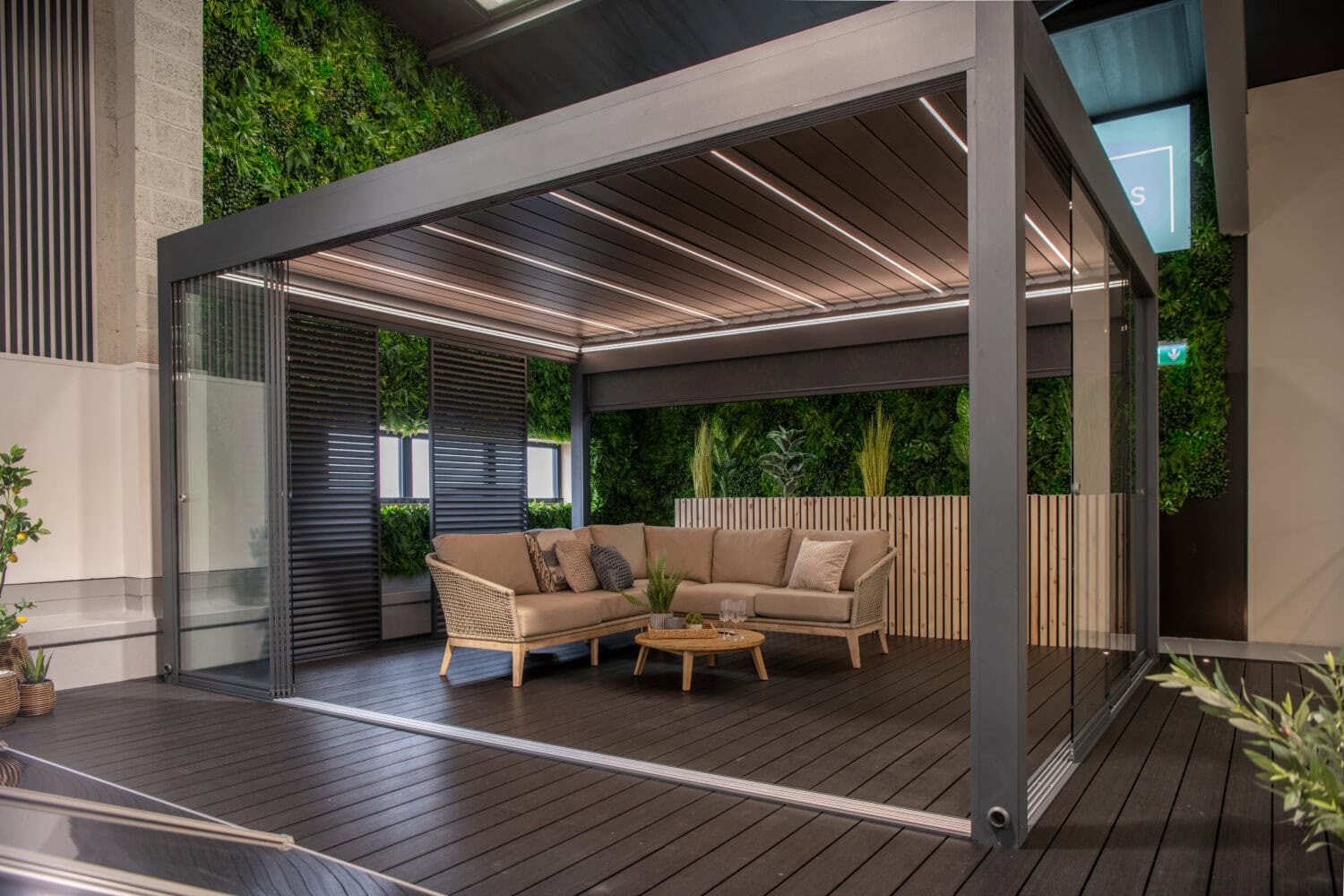The new space is adaptable and interchangeable thanks to the many bioclimatic features which make this stunning new pergola an amazing space that can be enjoyed throughout the year.