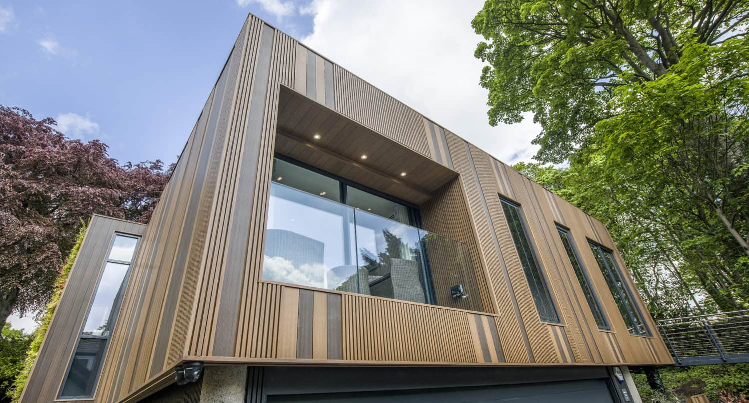 The homeowners wanted to construct a beautiful modern structure within the confines of their existing property boundary. Fundamental to the design would be the clever use of cladding materials to both conceal the structure and to seamlessly blend into the surrounding mature woodland. Internally our products would play a key role also with large areas of glazing designed to connect the interior with the woodland views outside.