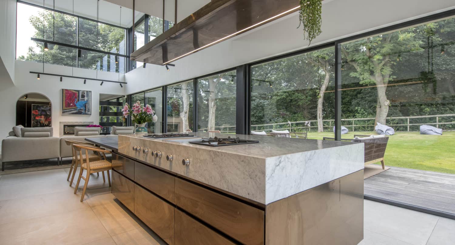 The whole extension is one large dream space from the double height atrium with glazed return, the outdoor patio that runs the full elevation and leads out to the garden in all three areas, to the master bedroom that benefits from slim sightlines & panoramic views also. The finished results of this project are stunning and one of the most impressive extensions you are ever likely to see. The brief has been wonderfully achieved, the front of the house is classically charming, a tasteful townhouse that implies of an ornate setting once inside. Stepping through into the open-plan extension is nothing short of spectacular, floor to ceiling glass, slim sightlines, panoramic views it’s an immediate wow factor from all angles and a great example of how visiting our showrooms can provide the working template as you work towards your own dream home.