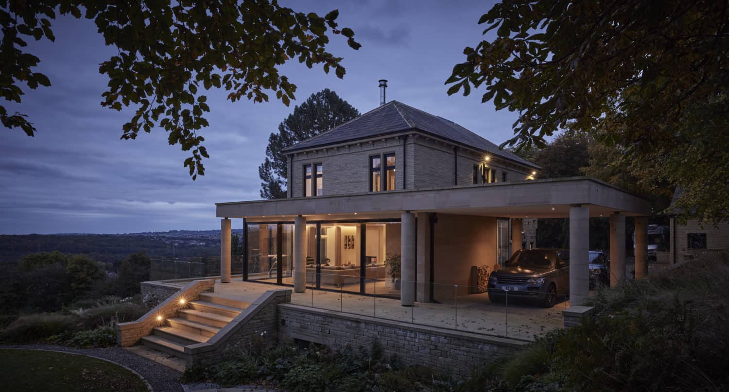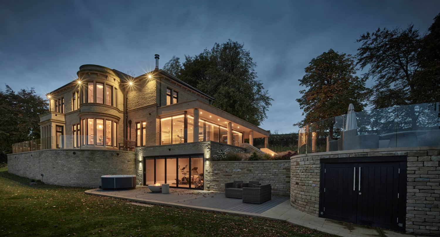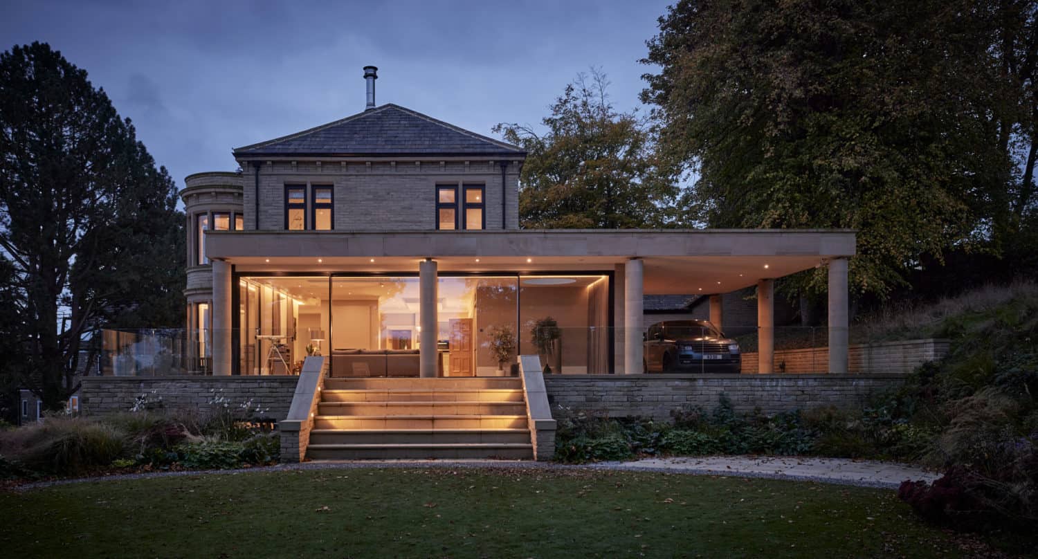 The design led approach wanted to make use of the properties stunning views located to the rear and side of the home. The experts at Orange Design Studio wanted to create an extension that was contemporary whilst not sitting at ‘odds’ with the house. To ensure the new extension was homogenous with the home they carefully sourced stone that matched existing home for the first-floor element of the extension. The extension was designed to wrap around the existing home using a beautifully sawn ashlar stone with monolithic elevated circular columns to create a walkway to the upper terrace. This combined with the expansive glazing was fundamental to creating a beautifully modern extension to this otherwise traditional property.