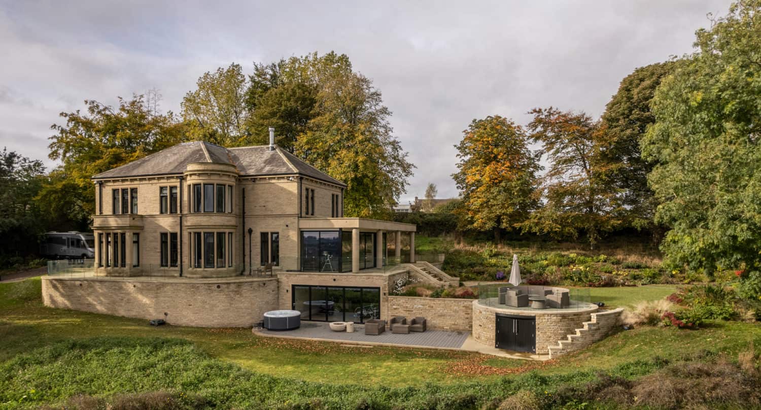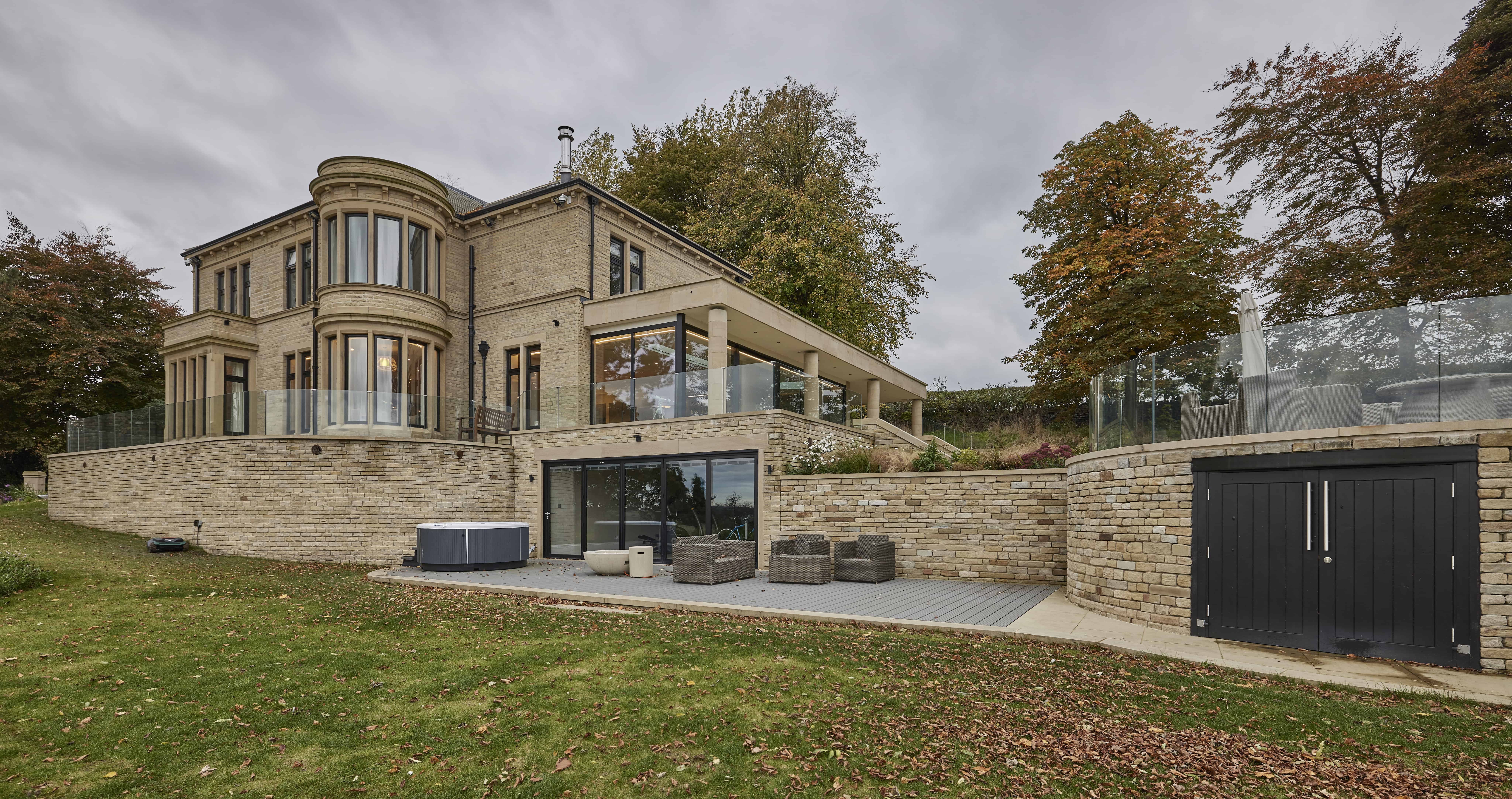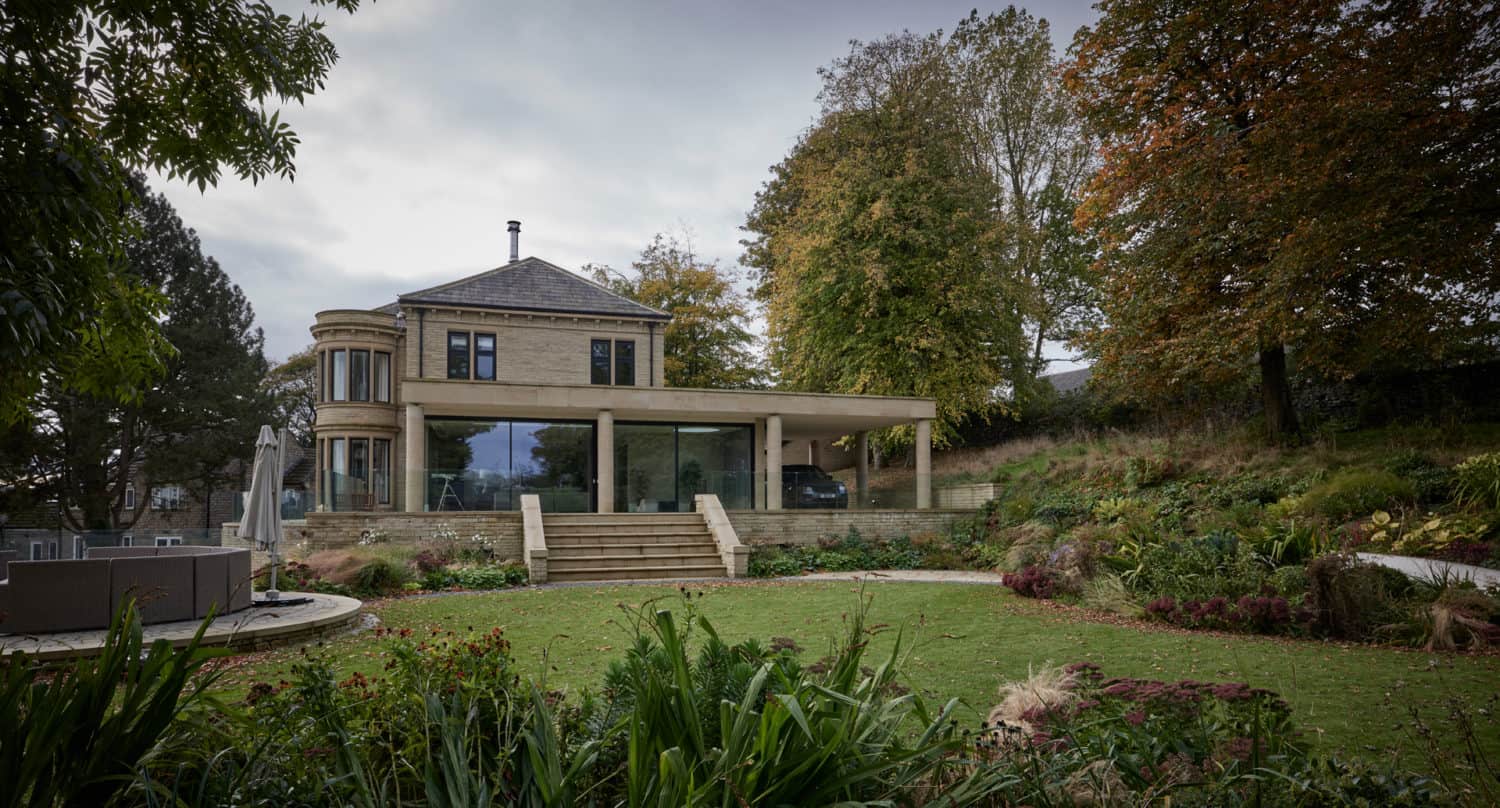 The design led approach wanted to make use of the properties stunning views located to the rear and side of the home. The experts at Orange Design Studio wanted to create an extension that was contemporary whilst not sitting at ‘odds’ with the house. To ensure the new extension was homogenous with the home they carefully sourced stone that matched existing home for the first-floor element of the extension. The extension was designed to wrap around the existing home using a beautifully sawn ashlar stone with monolithic elevated circular columns to create a walkway to the upper terrace. This combined with the expansive glazing was fundamental to creating a beautifully modern extension to this otherwise traditional property.
