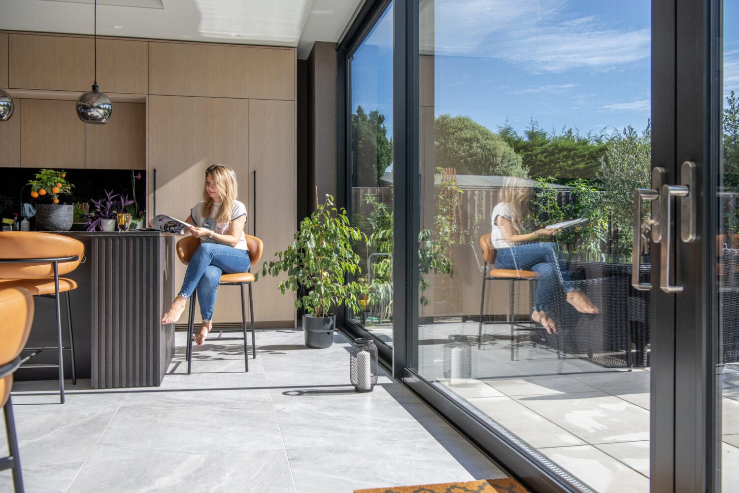 Lift and slide doors are perfect for huge doors such as this, so we used our heavy-duty XP Infinite system complete with a slim line 47mm interlock to create the backdrop to this new glass extension. The beauty of our lift and slide doors is that the gearing elevates the glass making it easy to slide even at huge sizes such as this. The lift and slide function works in reverse also, allowing you to drop the gearing onto the roller which secures the door in place in any open position, a great solution for ventilation or for when children are playing in and around the doors. Lift and slide doors are ideal for exposed high weather locations & for huge door sets such as this. The lift and slide functionality is extremely popular among families with young children, and people in their senior years who want a door that is very easy to slide and operate.