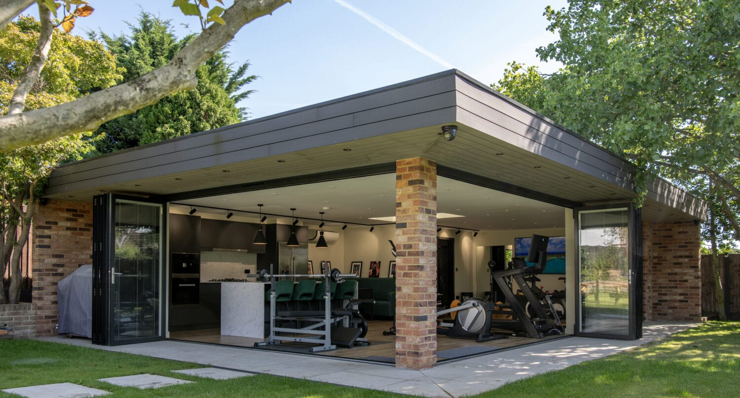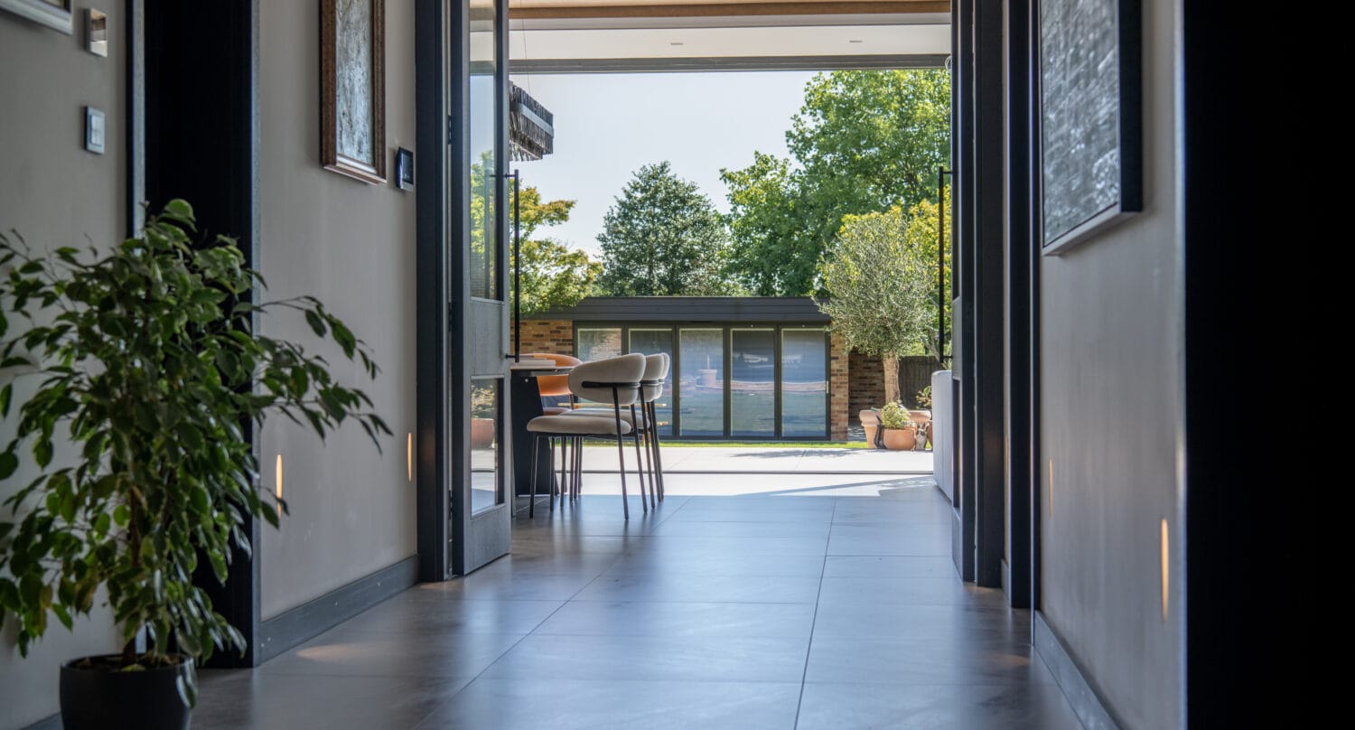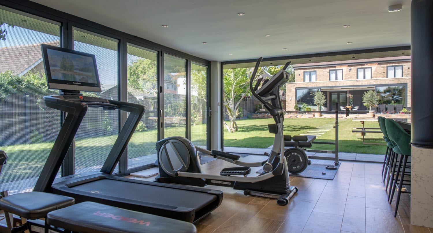 The garden room is one of the most impressive we have ever seen and the superb inside out design see’s the main house glass doors lead straight out across the raised patio and down a stone walkway to the garden room. The beauty of our products is how our sliding and bi-folding doors can transform a space and immediately bring the outside in. This is wonderfully achieved here particularly when the bi-fold doors are open in the garden room creating an open-air gym at the foot of the garden, that leads up the garden path through the five-metre opening within the sliding doors and straight to the front door, the very definition of inside, outside living.