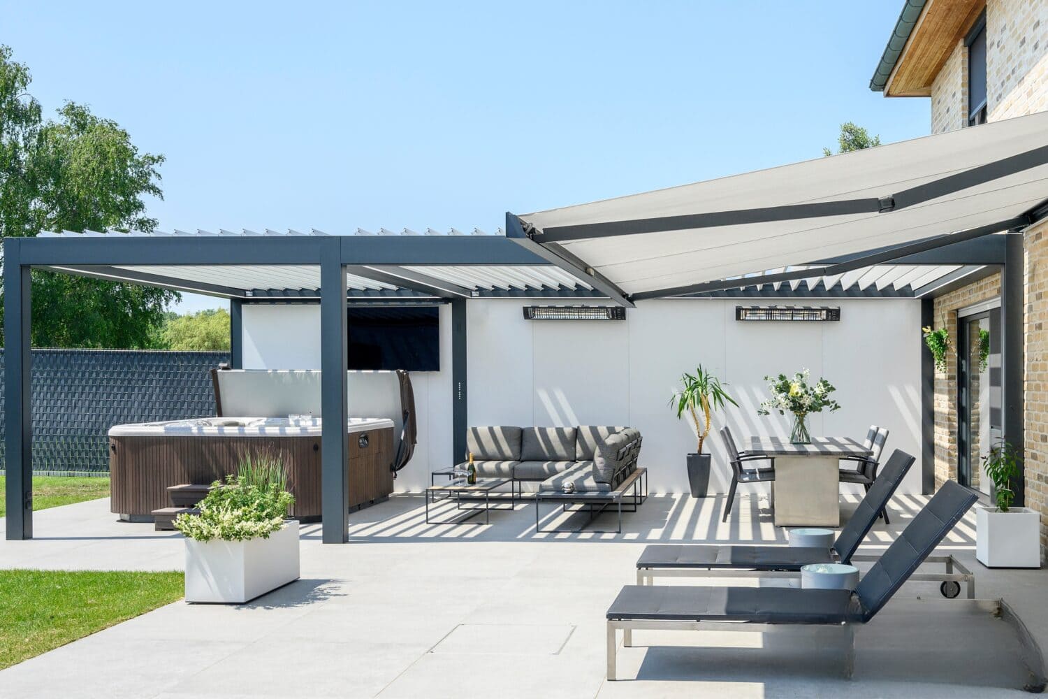 A louvred roof pergola provides adjustable sunlight control throughout the day. Open louvres invite warmth. Closing them offers shelter during light rain. This adaptability extends seasonal use without permanent enclosure.