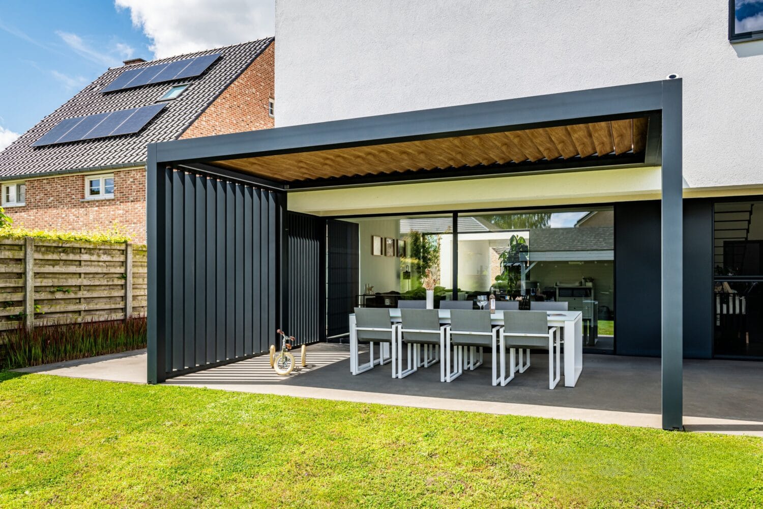 Where parking or storage is required, pergola systems can also be adapted as carports, using the same aluminium structure and roof technology for a consistent, unified appearance.