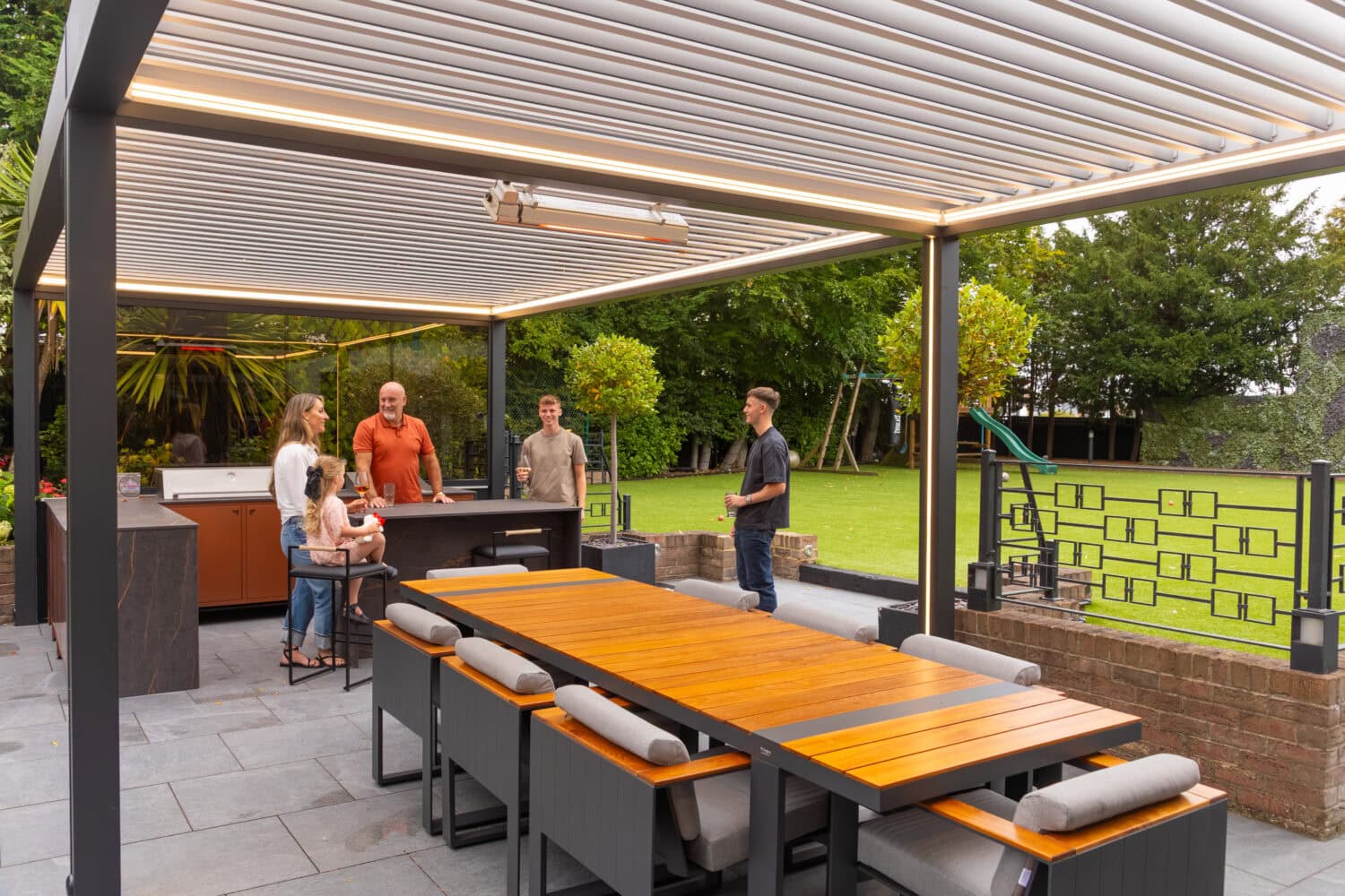 With the correct outdoor structure, your garden can remain an enjoyable space for autumn hosting, regardless of the conditions. Patio areas covered by glass verandas and aluminium pergolas establish comfortable outdoor rooms when the weather begins to chill. Adjustable louvres can be electronically operated on bioclimatic pergolas to block out icy winds and provide shelter depending on the weather. Optional features, such as built-in LED perimeter lighting and integrated heaters, contribute to a cosy and welcoming space with a warm ambience. As our Managing Director, Steve Bromberg, observes,