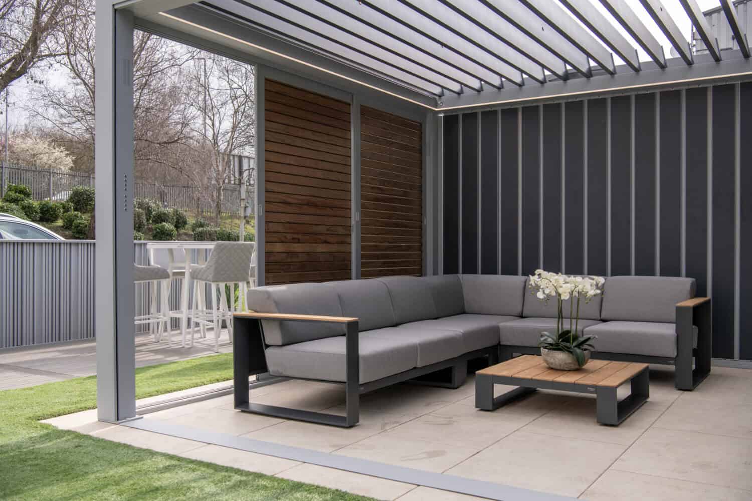 Bioclimatic essentially means a pergola with a electronically controlled roof. The roof louvres can be rotated, opened and closed to suit the weather.