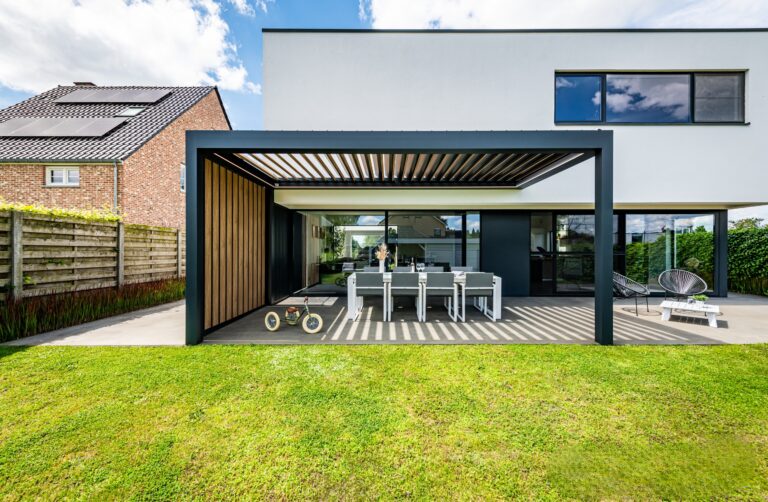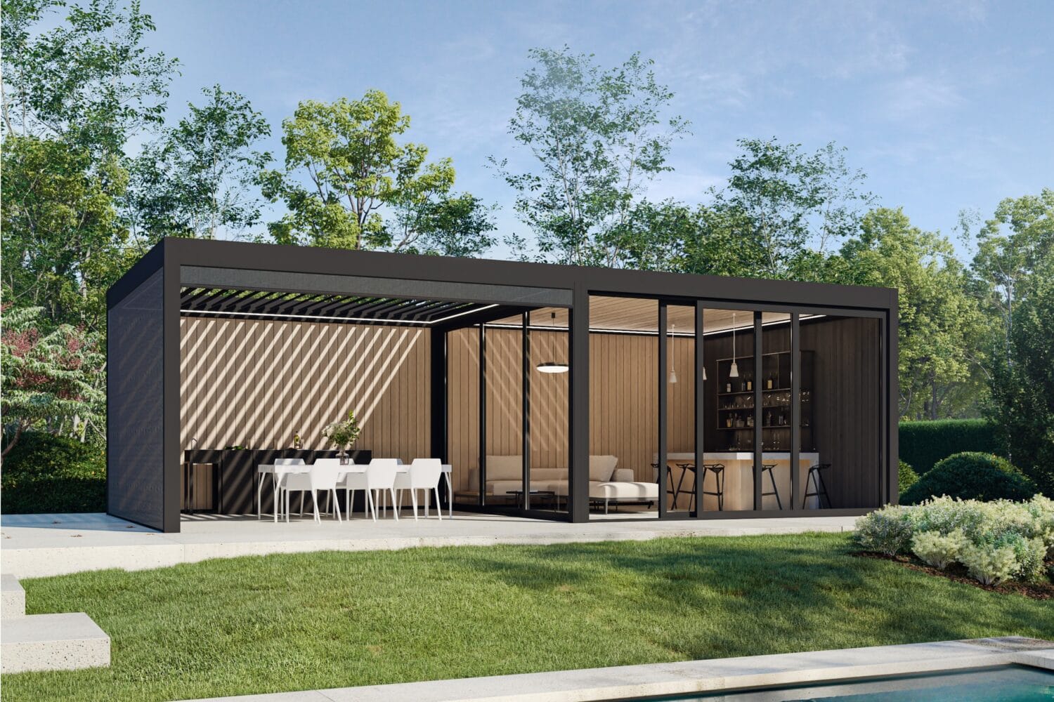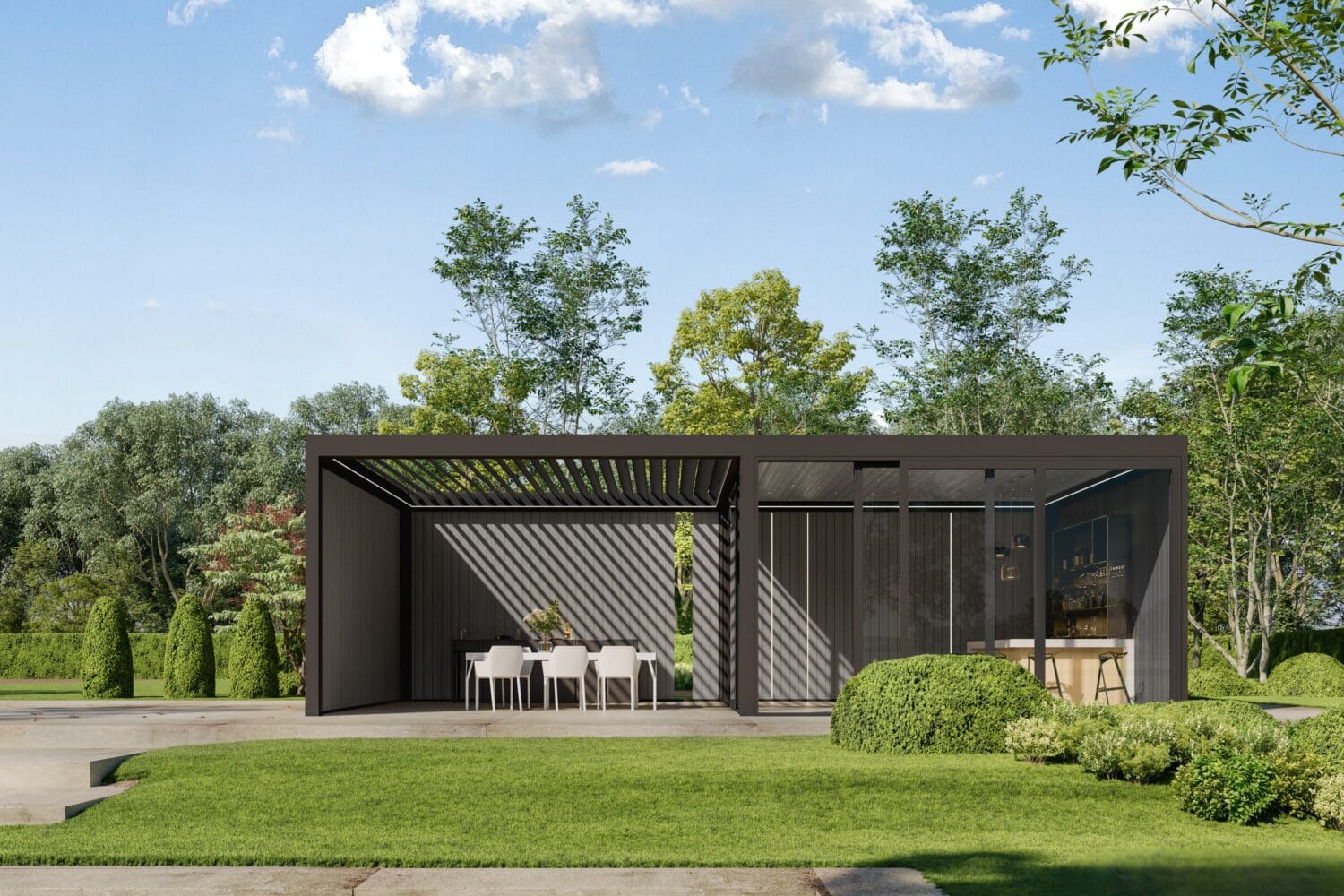 The combination of an aluminium louvred roof, or a glass roof with a fixed wooden roof creates a striking and modern look while adding a large amount of flexible space into your garden. Our outdoor rooms are 100% modular and you can fully personalise them yourself by assigning a specific role to each space, such as a lounge area or an outdoor kitchen.