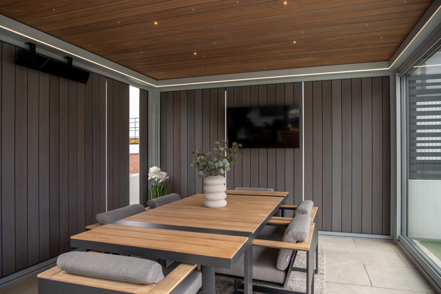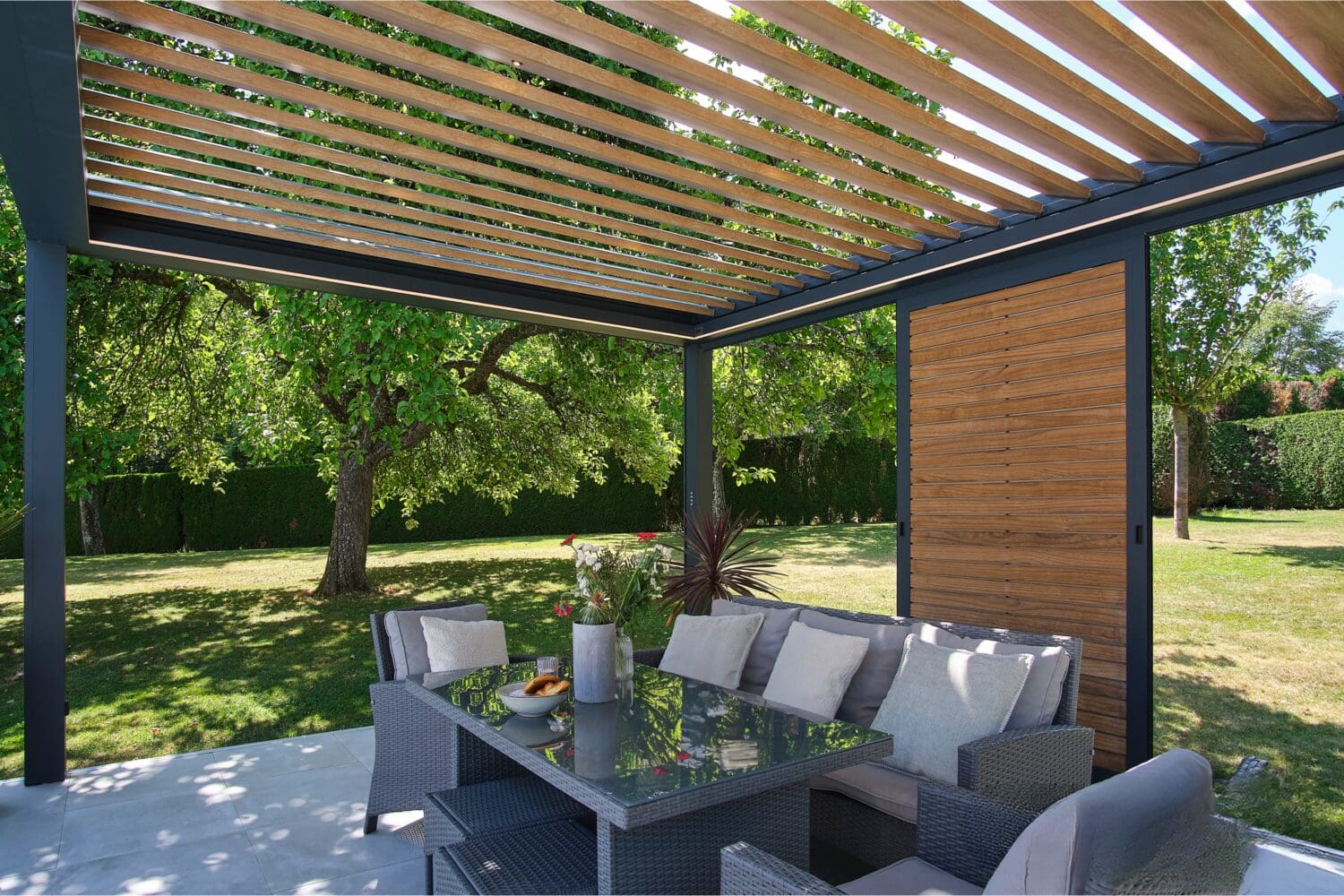 Do you want to hide that ugly fence behind your pergola? Or add in a flexible shelter from the wind? Wooden sliding walls are a stylish addition to your pergola that add both warmth and depth. The screens are made from a maintenance-free thermowood and have a stylish fabric on the outside