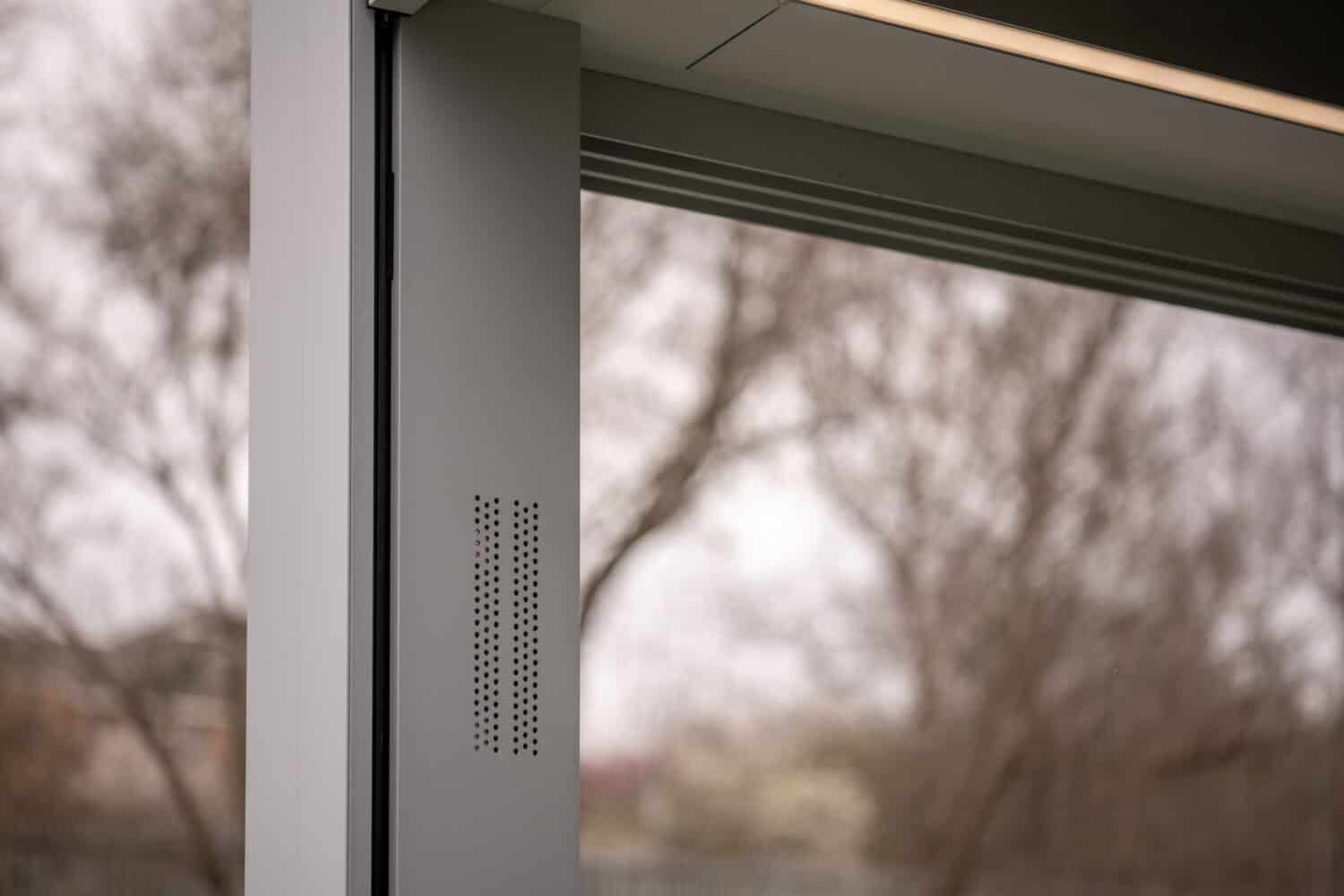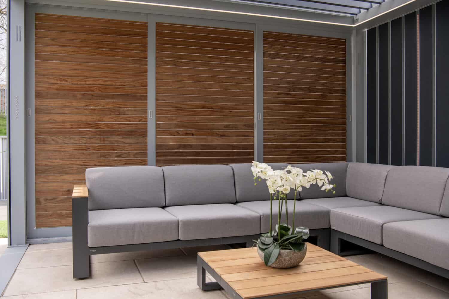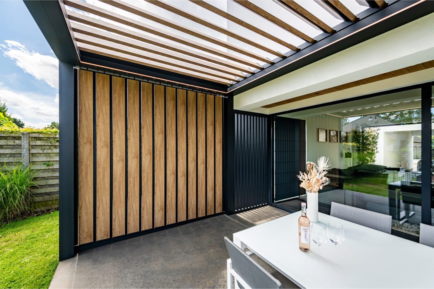 A favourite of ours, this distinctive partition is available with atmospheric RGB lighting. A modern side wall that looks great while adding flexibility into the structure. These vertical aluminium louvres can be opened and closed, can run the full width of the side enclosure or just part of it and are available in a dual colour, woodgrain finishes and with manual or motorised operation