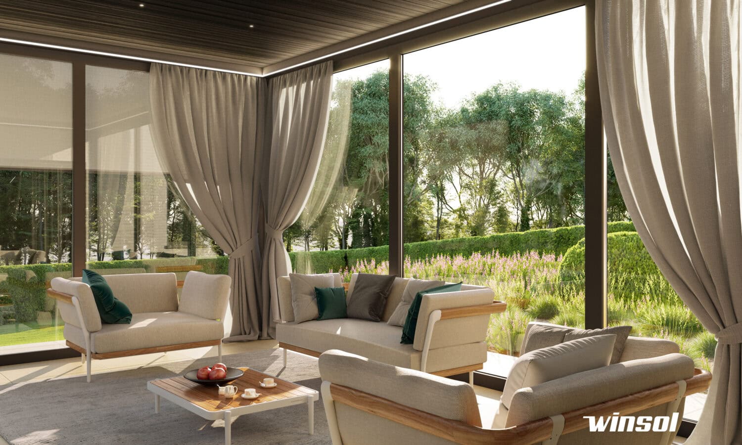 A holiday feeling in your own garden. These outdoor curtains are made from the same material as ski wear and are perfect to use as a decorative element or for more privacy and protection from the sun. Adding water and dirt repellent, UV and rot resistant curtains into the pergola makes the space feel very homely and with a choice of 58 colours and 4 different fabrics, just like the whole Winsol range, you’re certainly spoilt for choice.