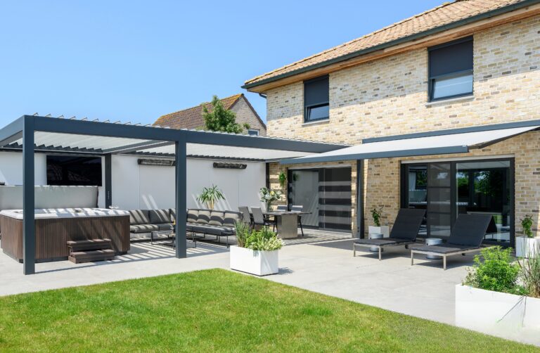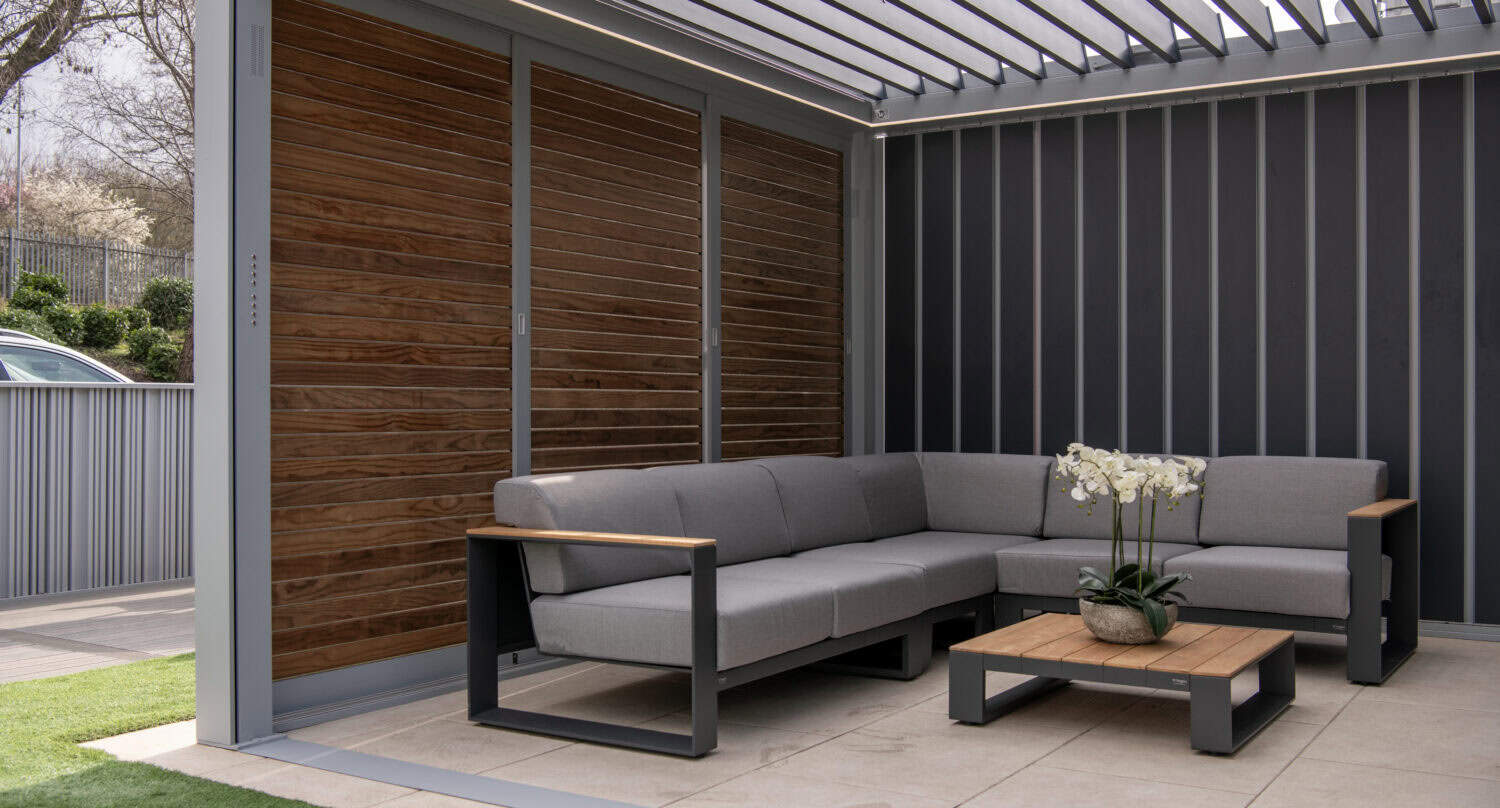 Louvre roof pergolas that can be open or closed offering rain, sun and wind protection.