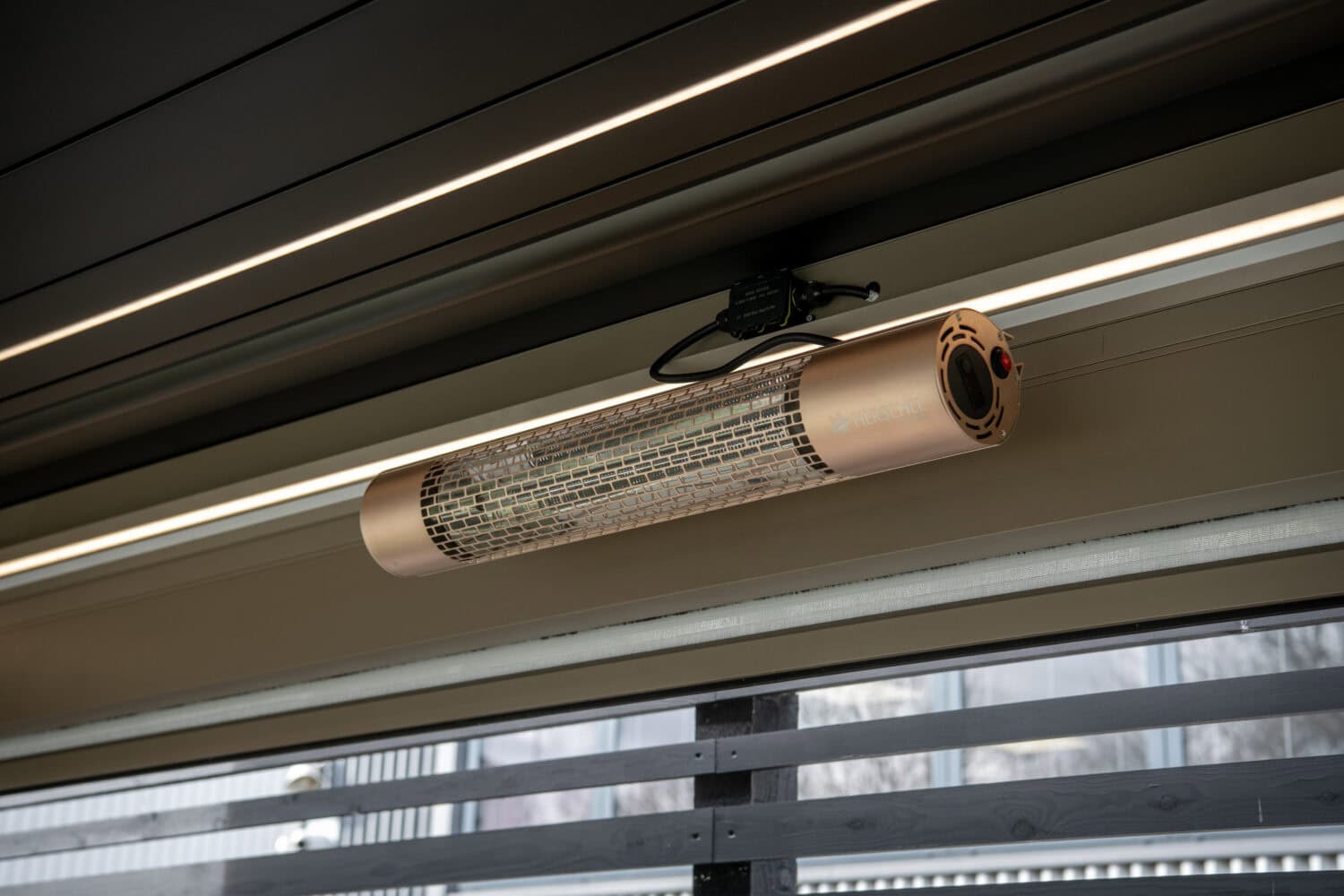 We strongly recommend integrating heaters into our pergolas to allow you to use the space throughout the year. We offer two premium infrared heater options, the Burda IO heater which looks great and is fully compatible the Somfy Tahoma app. The Burda Relex glass is another great option along with the more cost-effective Herschel California & Colorado ranges. The latter three options can be turned on and off on the app also, but the temperature is controlled on a separate remote control.